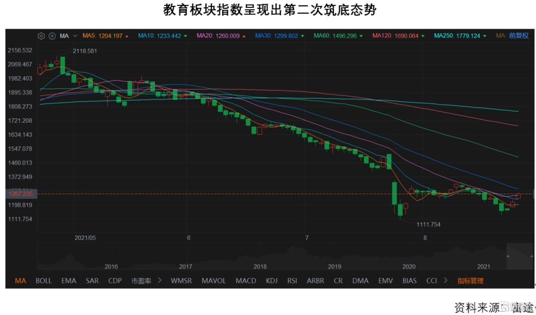 在過去半年,強力的教育監管政策給整個教育股票標的帶來了接近毀滅性的打擊,監管政策主要指兩個,其一是《雙減》、另一個是《民促法實施條例》。將賽道分細了來看,教育行業的四大賽道,民辦學校、K12 培訓,職教培訓和高教集團全部承受了不同程度的傷害,這反應的是市場在對極度恐慌情緒下的一輪泥沙俱下。目前從政策面來看,2021 年秋季學期開學在即,短期內不太有可能有新的重大利空,而從盤面來看,教育指數現已呈現出第二輪的築底態勢。因此,當利空靴子落地,恐慌情緒逐漸消退後;對於以高教集團為首被錯殺的子賽道和標的則很可能出現價值迴歸,其龍頭代表是中教控股 (00839.HK)。