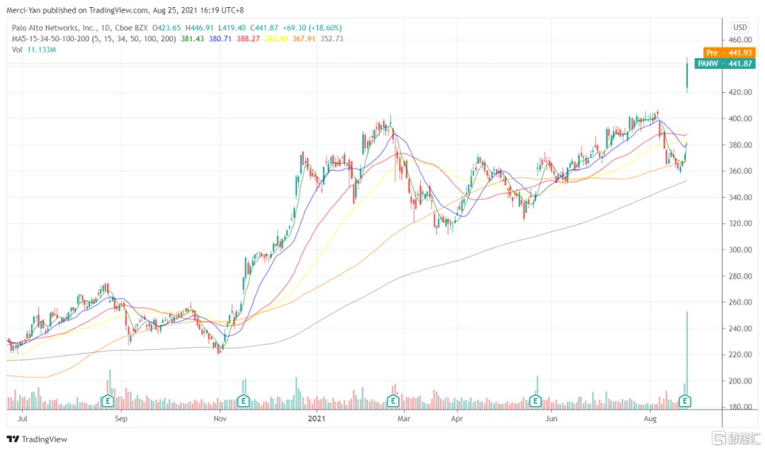 Palo Alto Networks(PANW.US)因為業績超預期,並且發佈了高於預期的指引,收漲 18.60%。