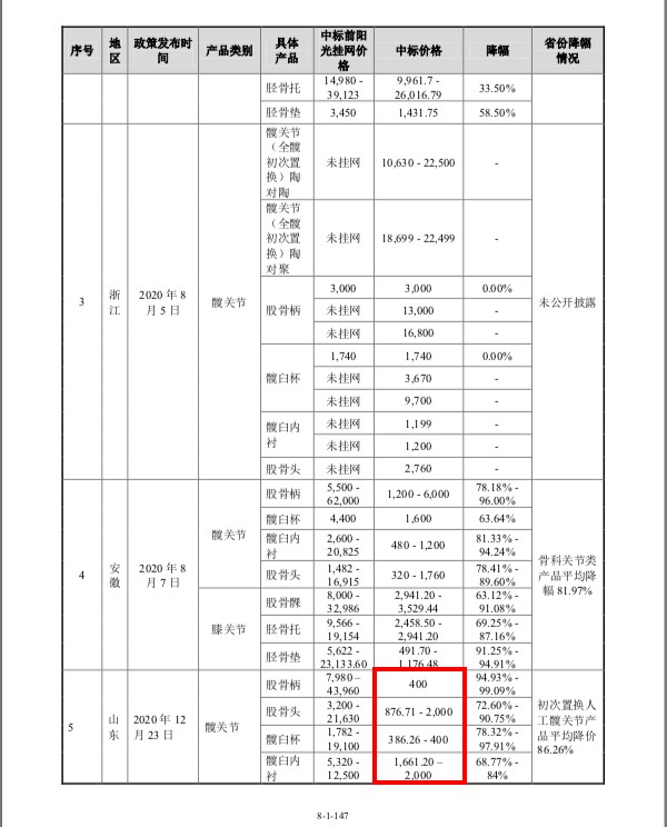 另據春立醫療統計,在目前已完成的部分省份的關節集採試點中,關節整體降幅在 32.12% 至 86.26% 左右(即終端銷售價格或掛網價的降幅),但公司出廠價下降幅度一般在 20% 以內。