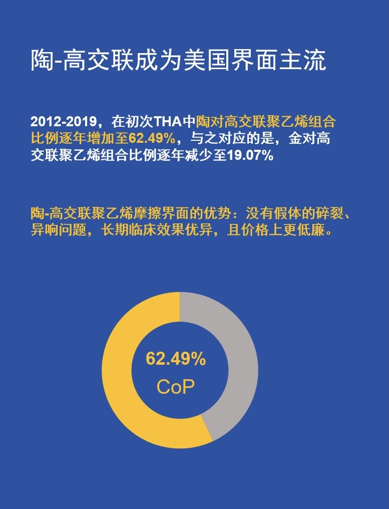 據華爾街見聞了解,目前在美國,陶瓷 - 聚乙烯類髖關節假體在初次全髖關節置換(THA)手術中的使用比例已經超過 60%,使用陶瓷 - 聚乙烯類髖關節假體的核心優勢在於異響概率低、且價格更為低廉。