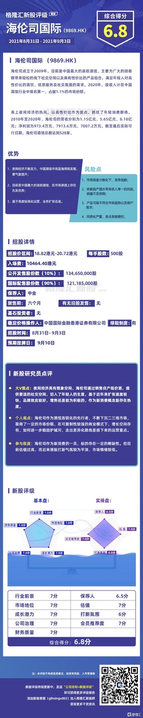 今天為大家帶來【海倫司國際】的新股評級。本評級主要圍繞基本盤、實操盤兩大維度,針對目標公司各項核心指標進行打分評級,滿分為 10 分,各指標單獨評分,按 “(權重佔比 * 分數) 之和” 計算,最終結果按照四捨五入得到。格隆匯新股研究根據已公開數據及獨家的內部評級體系,給予【海倫司國際】的新股綜合評估分數為【6.8】(滿分為 10 分),如下圖: