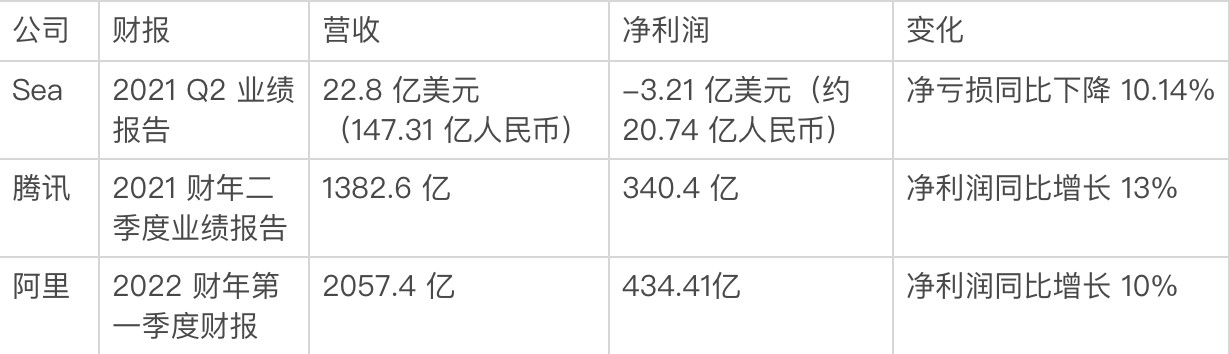 截止發稿,Sea 的市值已經達到了 1784.89 億美金(約 1.154 萬億人民幣),對比騰訊約 3.737 萬億人民幣、阿里 2.881 萬億人民幣的市值有一定的差距,但實際上幾個公司的盈利能力差別依舊很大。