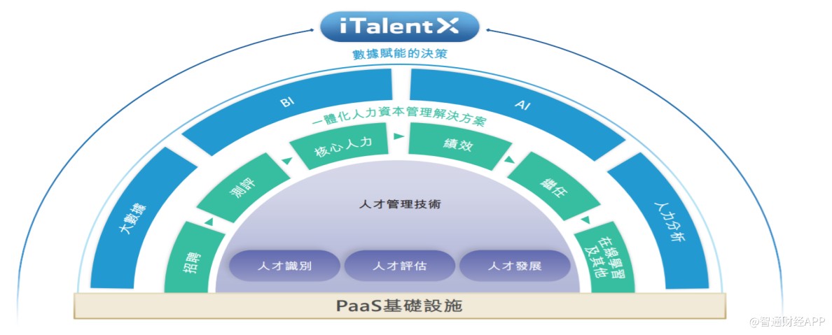 據招股書顯示,北森控股的雲端 HCM 解決方案是基於雲端 PaaS 基礎設施上搭建的 iTalentX 平台,該平台是雲原生、多租户架構,其上不僅提供招聘雲、測評雲、核心人力解決方案、績效管理雲、繼任雲、在線學習雲及其他的 HCM 員工全週期雲服務,亦基於平台的大數據和 AI 技術,在應用層上搭建人力資源數據分析引擎,從而為中國企業提供人力資源數據分析服務。
