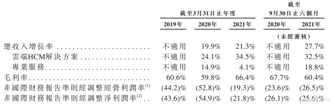 智通財經 APP 發現,2020、2021 財年以及截至 2021 年 9 月 30 日止的 6 個月,北森控股雲端 HCM 解決方案的收入增速分別為 24.1%、34.5%、32.5%,保持快速增長。而同期專業服務的收入增速為 14.9%、4.1%、18.8%,低於雲端 HCM 解決方案的收入增速,且波動性明顯,這主要是因為疫情的影響導致若干項目推遲結算或推遲合作。