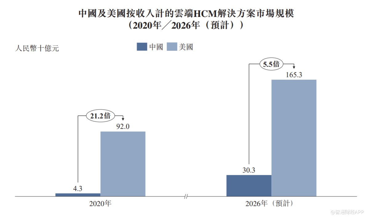 灼識諮詢表示,2020 年時,美國按收入計的雲端 HCM 解決方案的市場規模是中國的 21.2 倍,2020 年至 2026 年,中國雲端 HCM 解決方案的市場將以 38.2% 的複合增速增長,屆時美中兩國該市場規模的差距有望縮小至 5.5 倍。