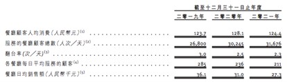 而報告期內公司的翻枱率分別為 3.0 次/天、2.5 次/天和 2.3 次/天。其中,一線城市的翻枱率分別為 3.0 次/天、2.5 次/天和 2.3 次/天,新一線城市的翻枱率分別為 3.2 次/天、2.7 次/天和 2.3 次/天,其它城市的翻枱率則分別為 2.7 次/天、2.5 次/天和 2.3 次/天。