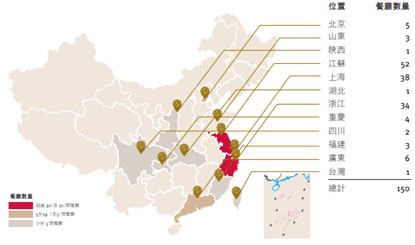 公司自 2010 年在上海開始經營,隨後在華東市場受到廣泛認可,並逐步在全國範圍內快速擴張。截至 2022 年 3 月 4 日,公司已在中國內地 30 個城市開設 149 間餐廳及在台北開設一間餐廳。公司的餐廳數量由截至 2019 年 1 月 1 日的 77 間增加至截至 2021 年 12 月 31 日的 148 間,並進一步增加至截至 2022 年 3 月 4 日的 150 間。截至 2022 年 3 月 4 日,公司在大中華區擁有及經營 146 間撈王鍋物料理餐廳、兩間鍋季餐廳及兩間撈王心靈肚雞湯餐廳。