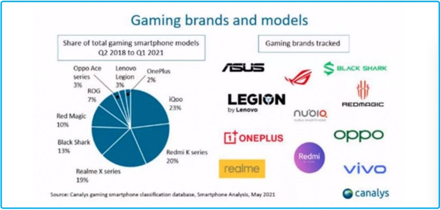 Canalys 發佈的 2018 年第二季度至 2021 年第一季度期間各大遊戲手機品牌的市場份額榜單顯示,在大廠旗下普通遊戲手機之外,行業默認的四大專業遊戲手機品牌黑鯊、紅魔、ROG、拯救者,四者市場份額之和僅為 33%。在這四大品牌中,黑鯊排名第一,擁有 13% 的佔有率。