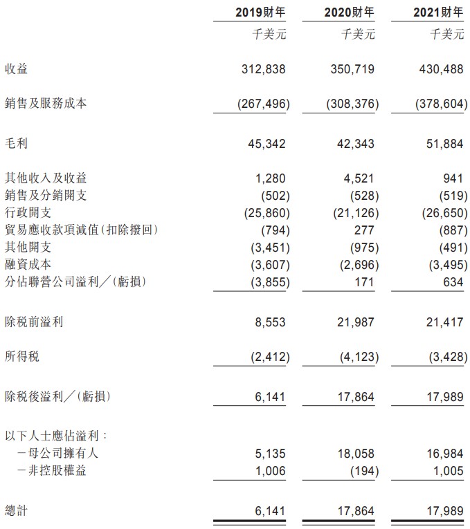 母公司擁有人應占溢利由 2019 財年的 513.5 萬美元增加 251.7% 至 2020 財年的 1805.8 萬美元,並由 2020 財年的 1805.8 萬美元減少 5.9% 至 2021 財年的 1698.4 萬美元。主要由於公司於 2020 財年確認修改其他借款後終止確認的非經常性收益 370 萬美元及行政開支增加,主要由於與上市有關的法律及專業費用增加以及公司增加行政人員的人數以應付業務增長。