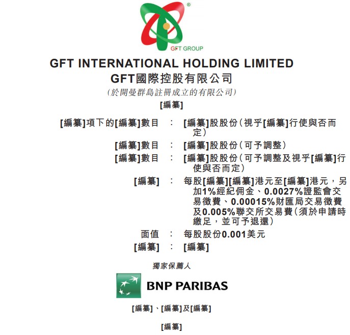 智通財經 APP 獲悉,據港交所 3 月 21 日披露,GFT 國際控股有限公司 (以下稱 “GFT 國際”) 遞表港交所,BNP PARIBAS 為其獨家保薦人。值得一提的是,該公司此前分別於 2021 年 1 月份和 9 月份兩次遞表港交所。