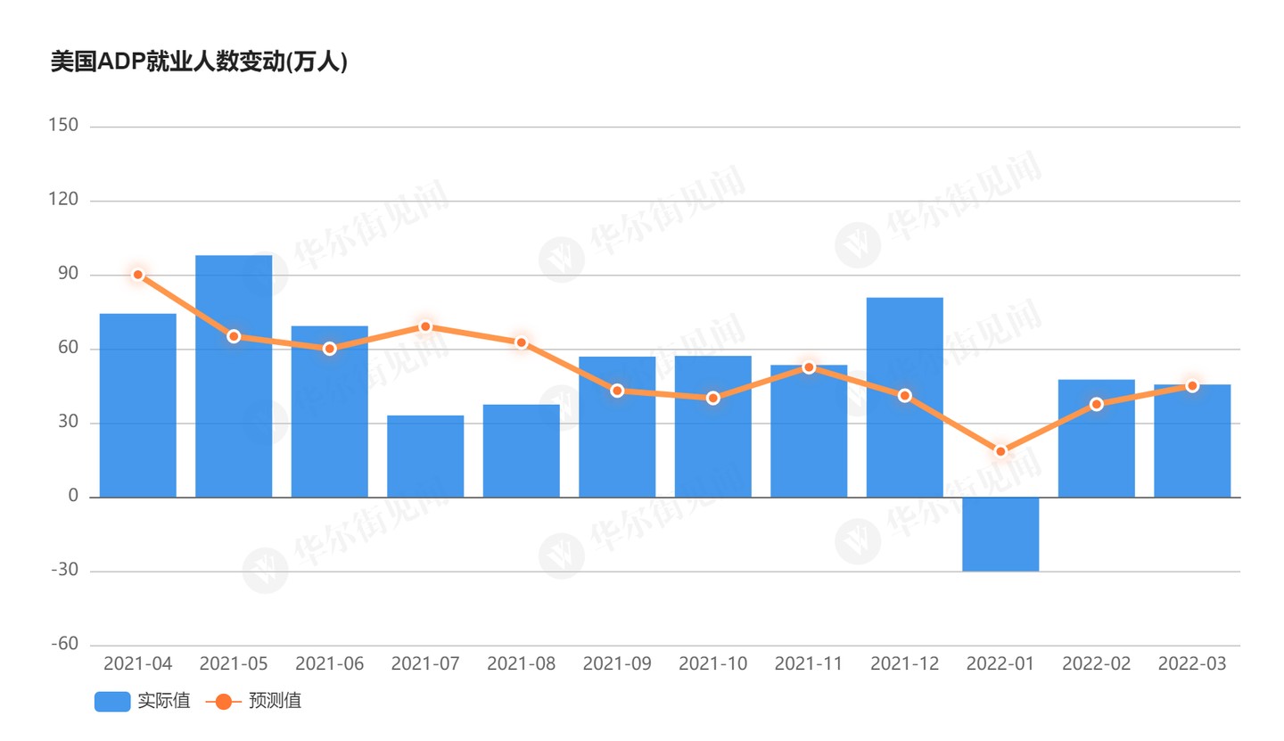 有 “小非農” 之稱的美國 3 月 ADP 就業人數增加 45.5 萬人,預期增加 45 萬人,2 月前值增加 47.5 萬人。一定程度上,該數據預示週五的重磅非農就業數據可能較為樂觀。