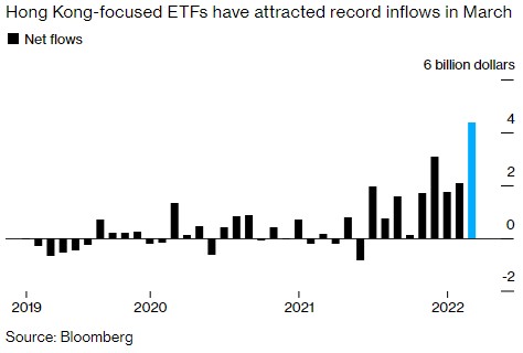 自 2 月底以來,大約有 60 只追蹤港股指數的股票型 ETF 淨流入 44 億美元資金,創下了自 2000 年有記錄以來的月度新高紀錄。