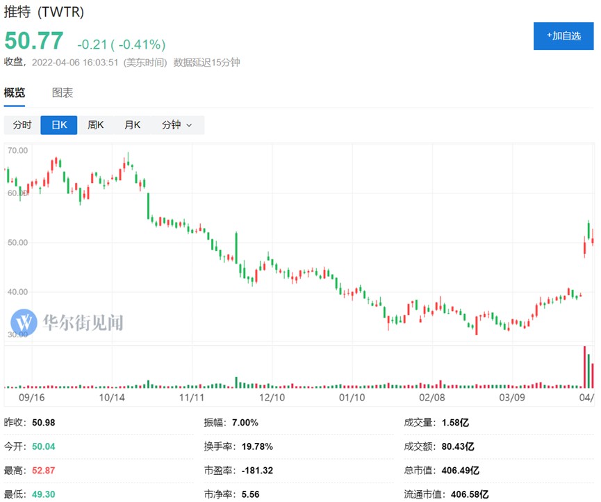 週一馬斯克披露自己持有 9.2% 的股權後,推特暴漲超 27%,創下 2013 年 IPO 首日收盤以來的最佳單日表現;週二盤中一度漲超 9%,不過午盤後漲幅回落,最終小幅收跌。