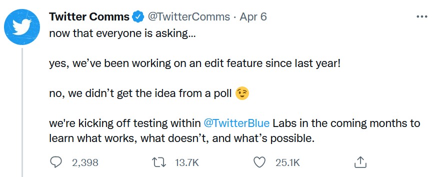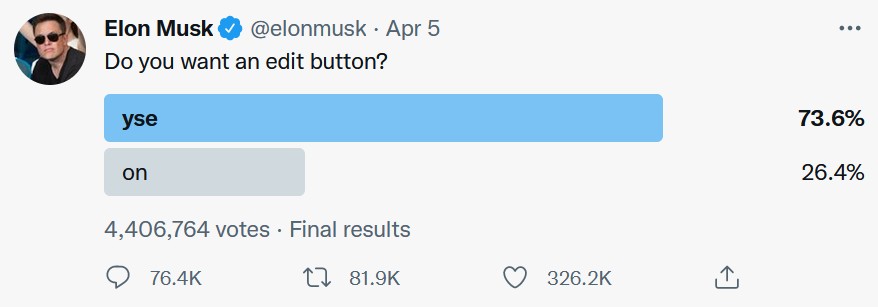 在宣佈購入推特 9.2% 的股份的同一天,馬斯克在推特上發佈一項調查:“你們想要一個編輯按鈕嗎”。