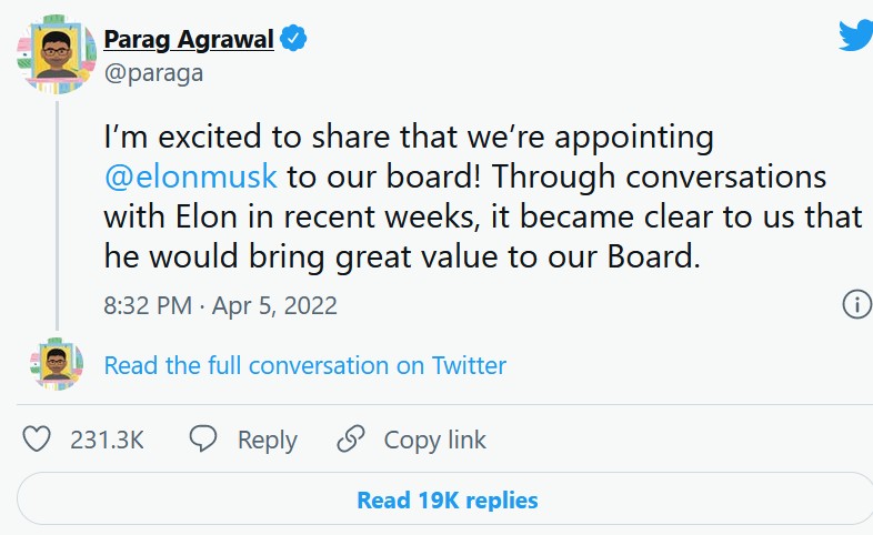 半個月後,馬斯克搖身一變成為推特最大的外部股東。