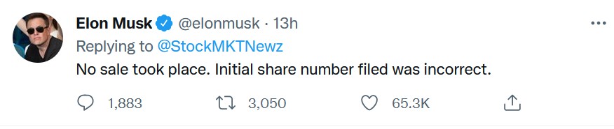 不過,很快馬斯克便否認出售推特股票,並表示最初數據有誤。