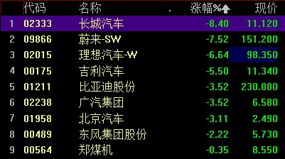 蔚來跌近 8%,理想汽車跌近 7%,小鵬汽車跌超 6%。