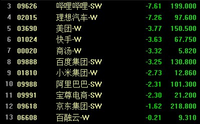 B 站跌超 7%,美團、快手、百度跌超 3%,小米、阿里跌超 2%。