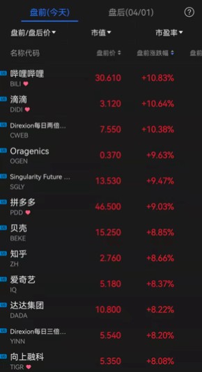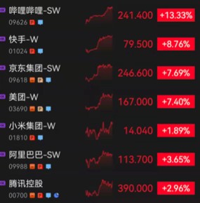 愛奇藝漲超 12%,嗶哩嗶哩漲超 11%,拼多多漲超 8%,京東漲超 6%,阿里巴巴漲超 5%。