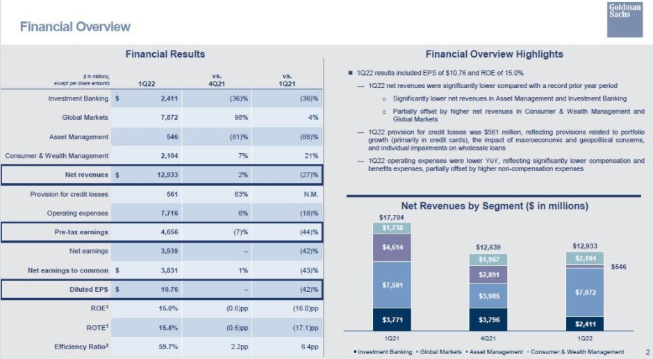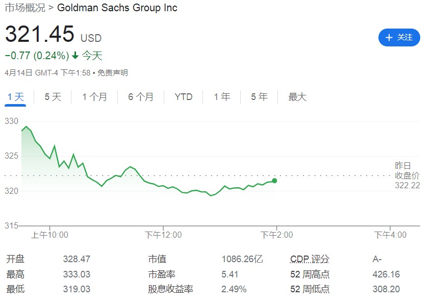 財報發佈後,高盛美股開盤股價小幅上漲 1.3%,隨後轉跌目前跌幅達 0.24%,年初至今高盛股價下跌超 18%。