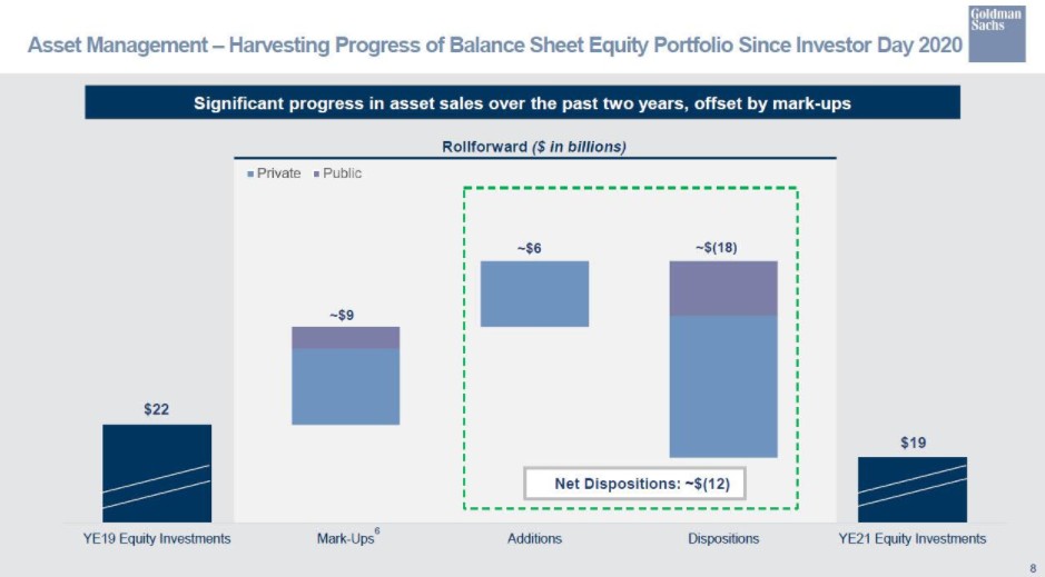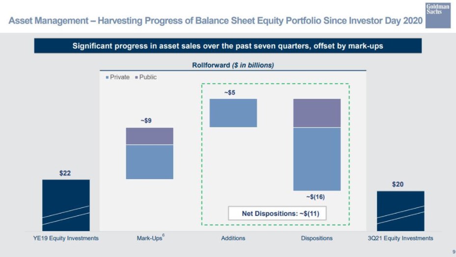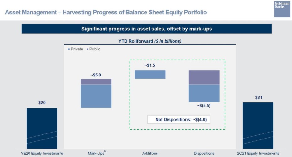 到了去年三季度,高盛財報又披露,自 2020 年 1 月 29 日高盛投資者日以來,資管業務股投資組合合計減持 160 億美元,計入買入股票 50 億美元后,淨拋售 110 億美元。