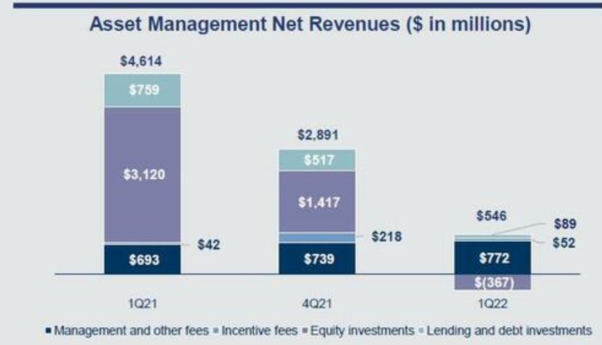 高盛財報顯示,資產管理的淨收入比一年前縮水了 88%,只有 5.46 億美元,低於一年前的 46 億美元。