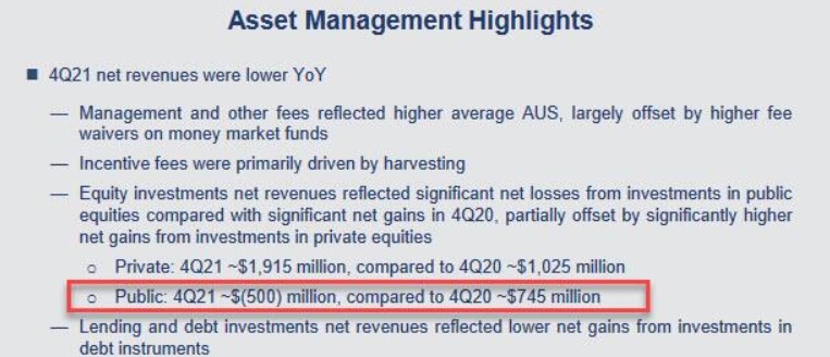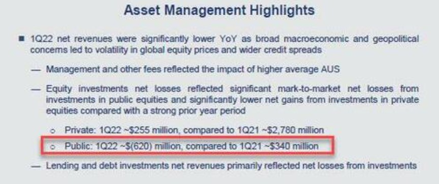 根據高盛的投資者報告,連續第三個季度,"股票投資淨損失反映了公開市場股票投資的重大按市價計算的淨損失。"