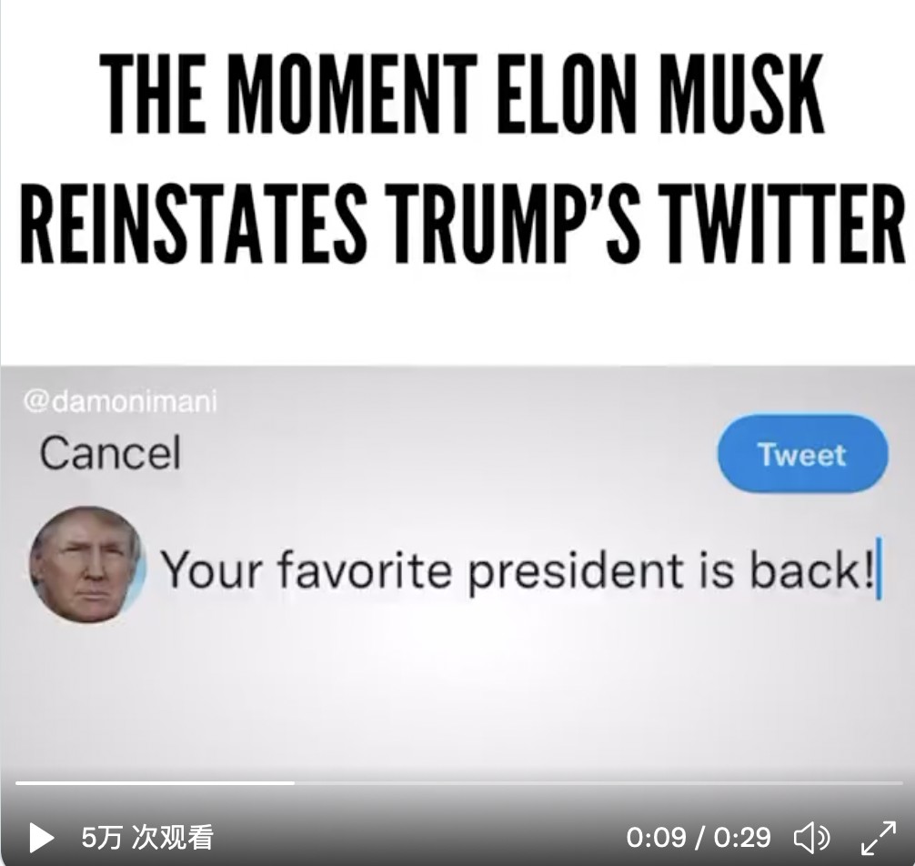 馬斯克號稱追求 “言論自由”,加之其與拜登的尷尬關係,推友們紛紛發文 “解封川普”,一個 “最愛的總統回來了” 的視頻廣泛傳播。