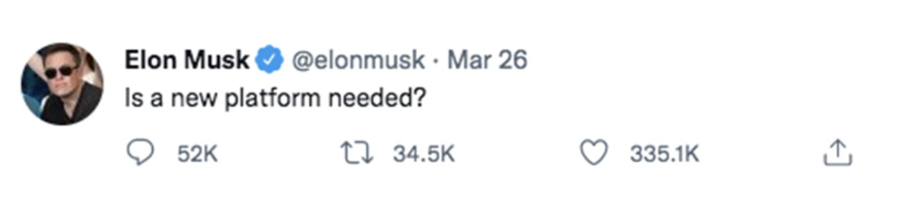 3 月 26 日,愛發推特的馬斯克連發數條推文,表達對推特的不滿,諸如 “推特消亡了嗎?”、“你們需要一個新的社交平台嗎?”、“推特沒有言論自由了,應該如何修正?” 此類的靈魂拷問,一時間引起推友們的熱議,也有網友調侃道,你應該買下推特。