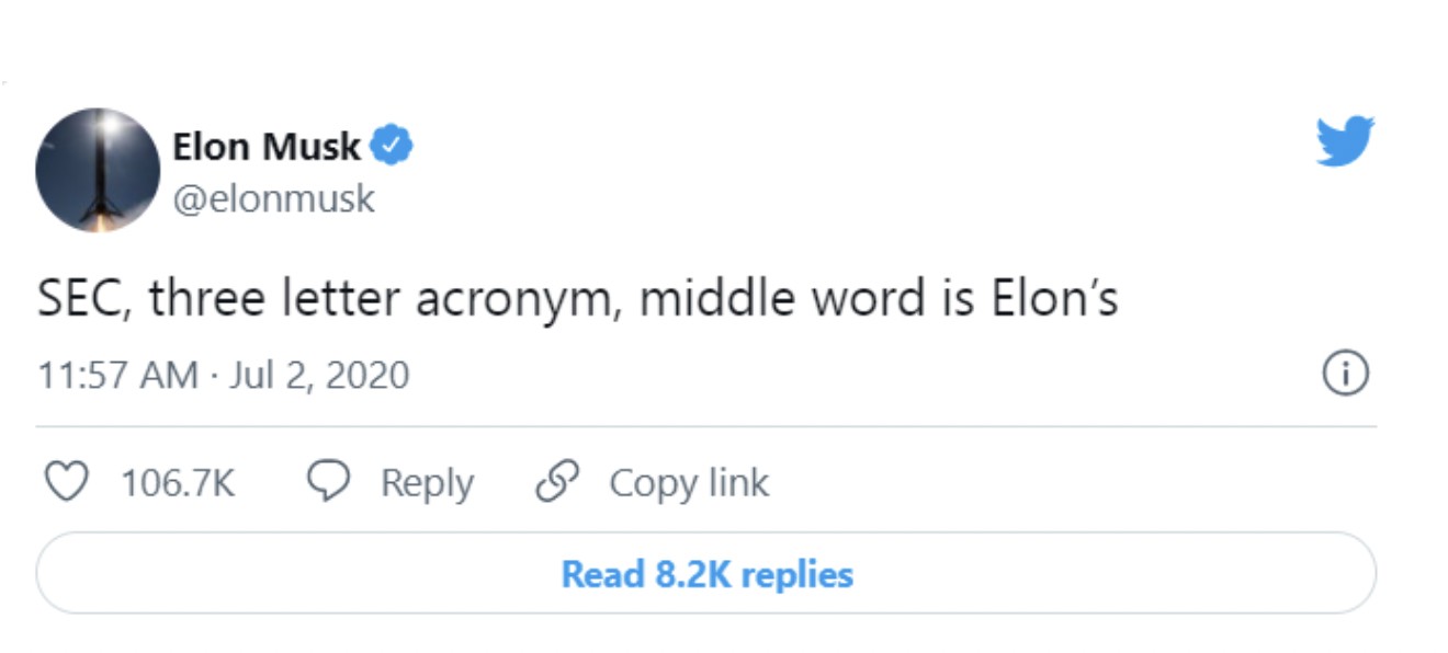 從那以後,馬斯克和 SEC 積下了恩怨,馬斯克不但頻頻違反協議,還用隱晦的語言 “侮辱” SEC,不斷 “挑釁”。
