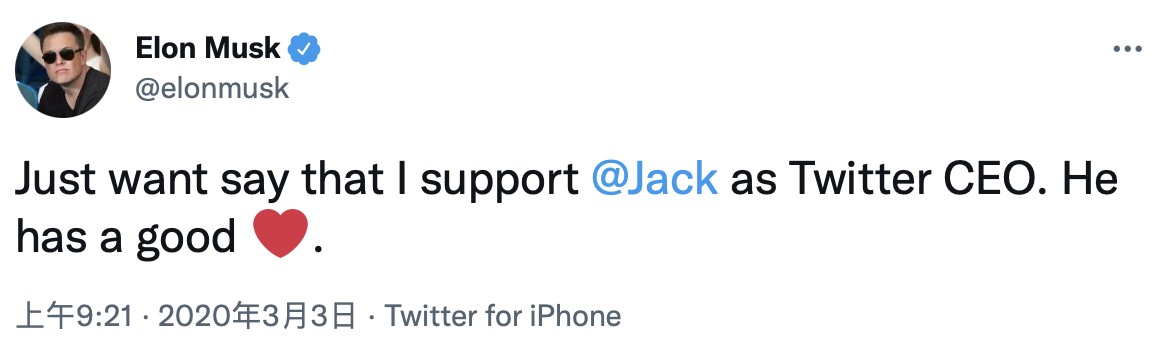 2020 年 3 月,對沖基金 Elliott Management 對多西發動攻勢,並推選新任首席執行官時,馬斯克支持多西,在推特上寫道,我只想説我支持多西擔任推特首席執行官,他人很好的,並加了一個比心的表情。