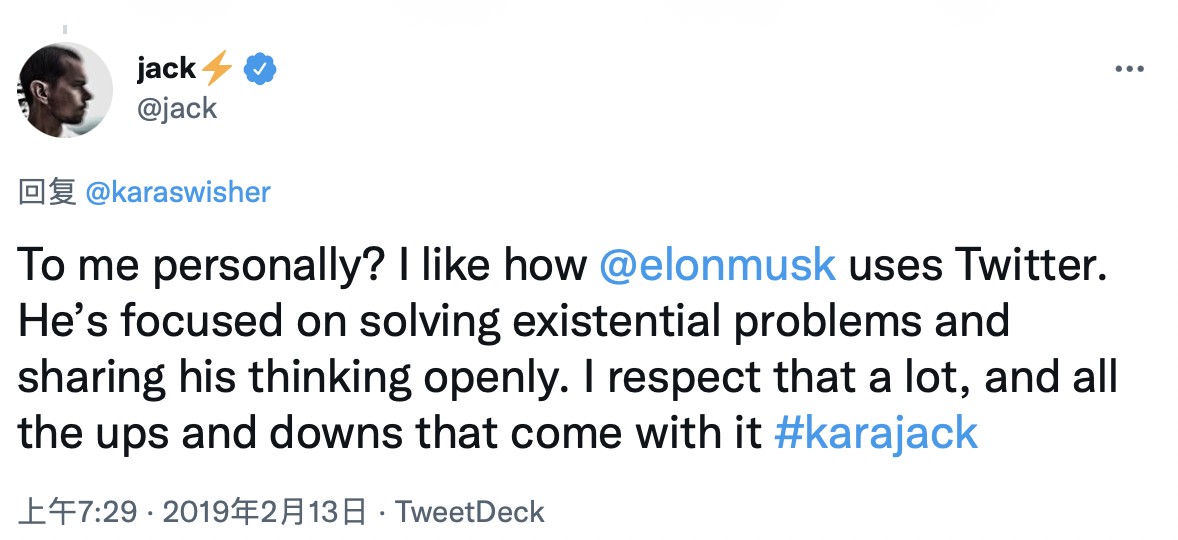 2019 年 2 月,當被問及推特上最令其興奮的人時,多西向馬斯克致敬。多西發推文稱,“我喜歡馬斯克使用 Twitter 的方式,他專注於解決存在的問題,並公開分享他的想法。我非常尊重這一點,以及隨之引發的討論。”