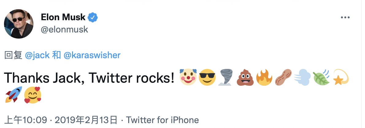 馬斯克以感謝和讚美回應,並表示推特很贊!還有 11 個難以理解的表情符號,包括小丑、龍捲風、一堆便便、花生和在風中飄動的樹葉。
