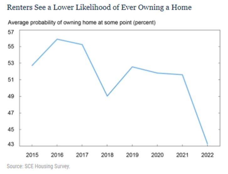 消费者已经对美国房地产市场感到悲观。纽约联邦储备银行 2 月份对无住房者进行的调查显示,他们未来拥有住房的可能性为 43.3%,低于上年同期的 51.6%,这是该数据历史上首次低于 50%。