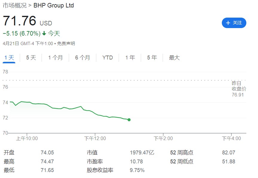 受此消息影響,截止發文,BHP 週四日內跌幅約 6.7% 至 71.69 美元,年初至今在俄烏衝突下大宗商品價格急劇波動影響,已累漲近 19%。