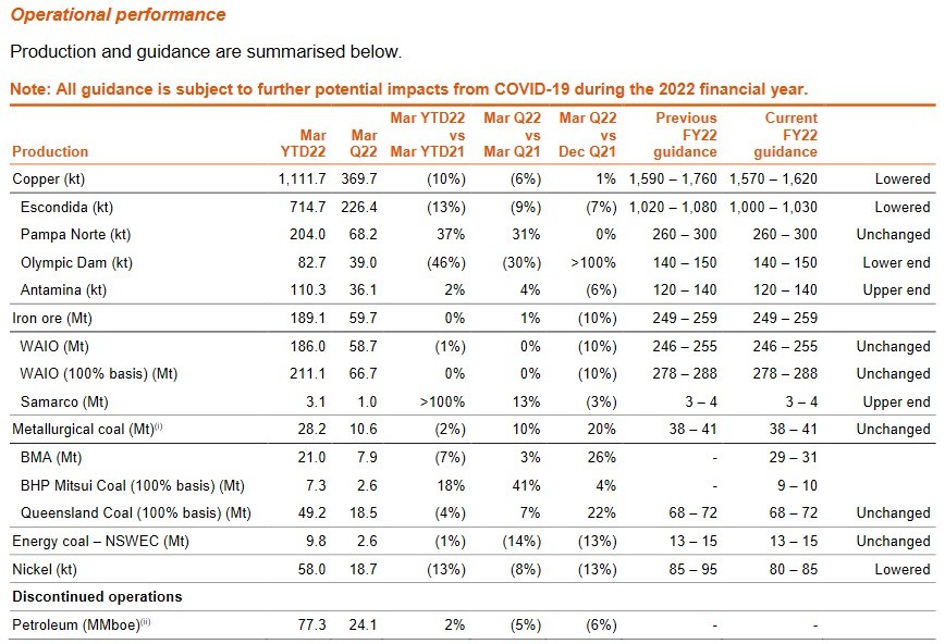 此外,在 BHP 公佈的其截至 3 月 31 日的 2022 財年第三財季業務報告中顯示,銅、鎳產量均下滑: