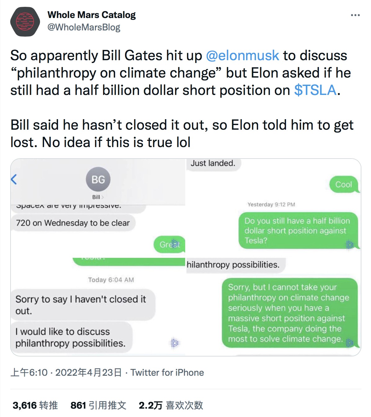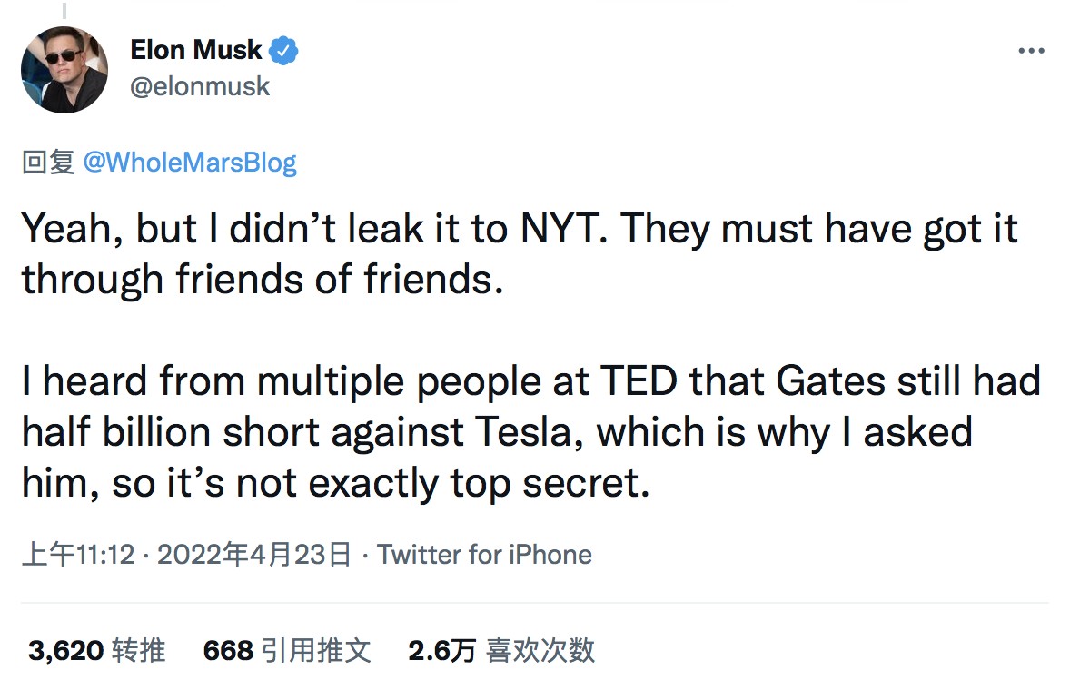這一次是馬斯克直接在推文中承認,他曾私下 “質問” 蓋茨是不是做空了特斯拉股票。
