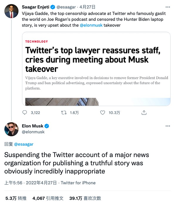 周三,马斯克在 Twitter 上回复了政治博客主持人 Saagar Enjeti 批评 Gadde 的一条推文,他说:“暂停一个主要新闻机构的推特账户,因为它发表了一篇真实的报道,这显然是非常不合适的。”