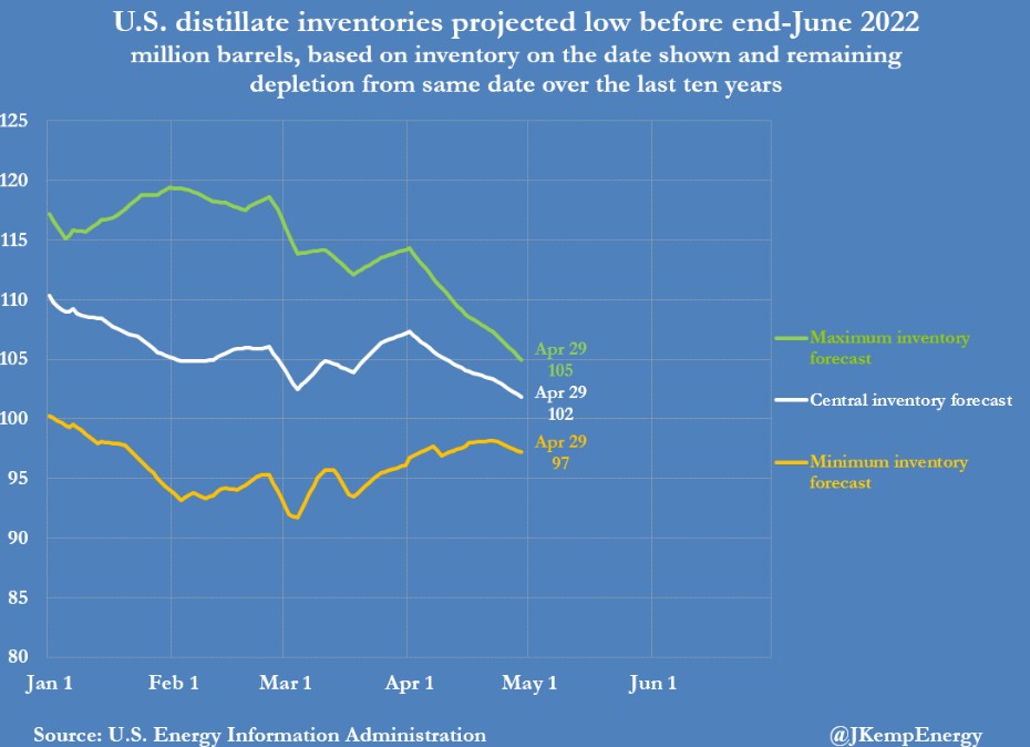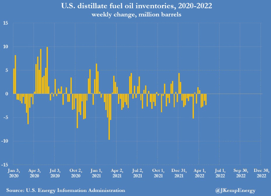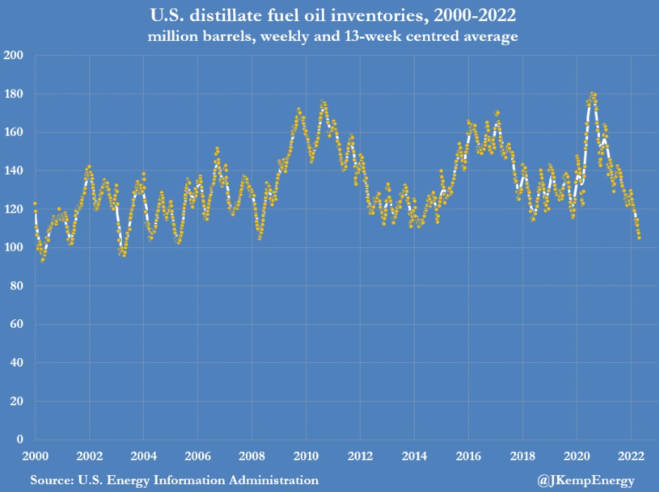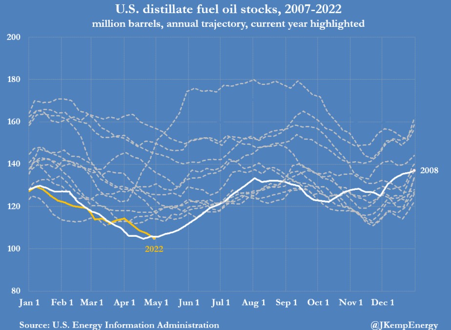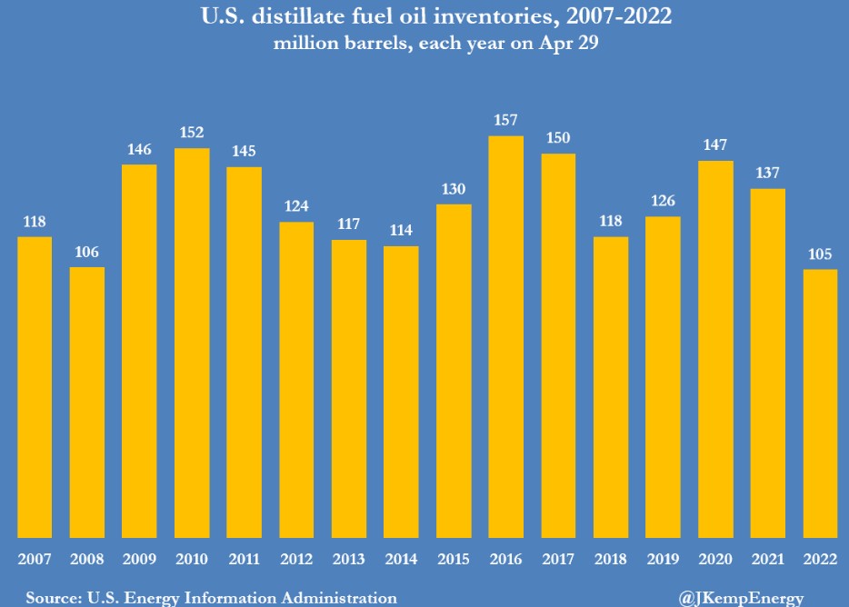目前餾分油庫存僅為 3100 萬桶,比 2015-2019 年疫情前的五年平均值低 23%。