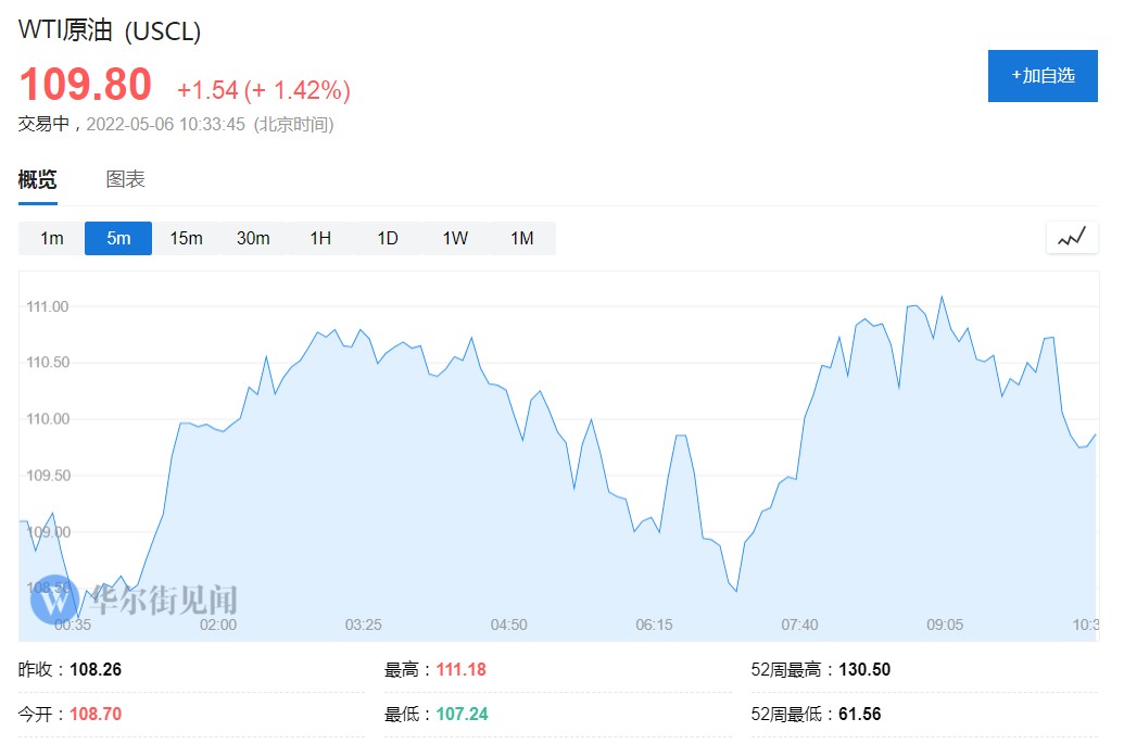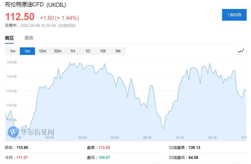 截止發文,布倫特原油日內一度漲超 2.1%,現小幅回落至 112.21 美元。WTI 原油也一度漲超 2.4%,目前漲幅收窄至 1.24% 暫報 109.80 美元。