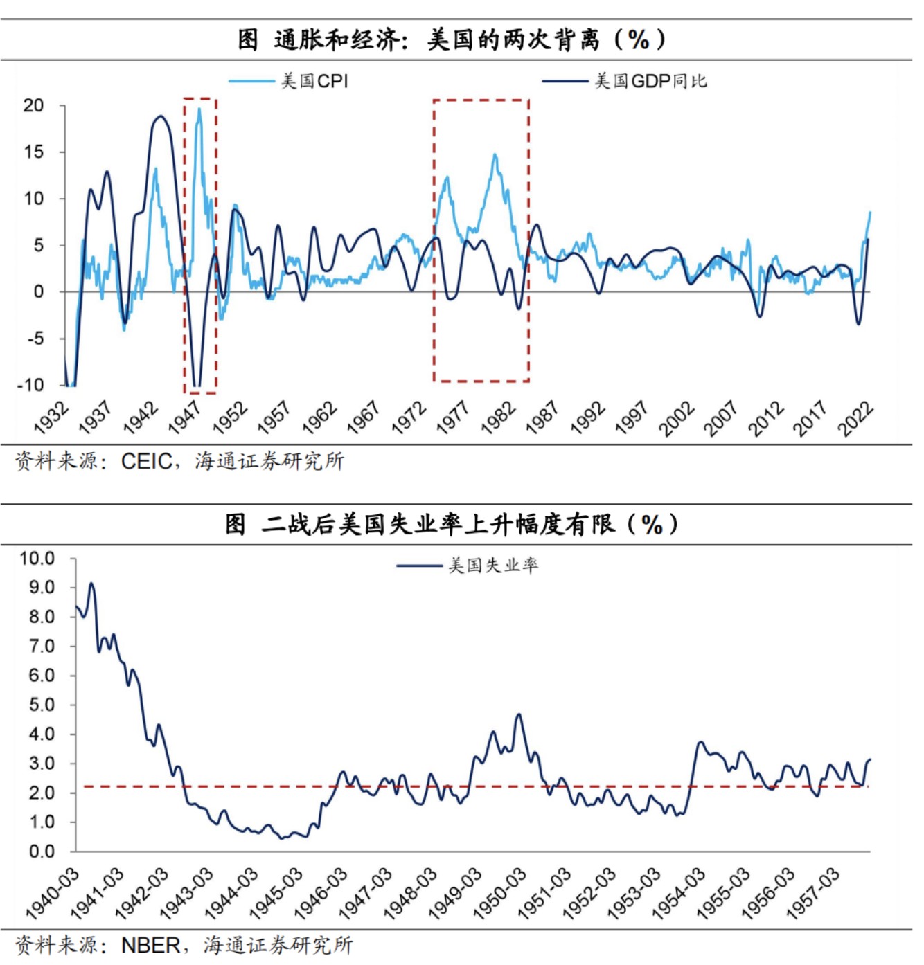 自 20 世紀 30 年代以來,美國總共出現過兩波明顯的經濟和通脹的走勢背離。第一波是在二戰結束後的幾年內,尤其是 1946、1947 年,經濟負增長,而通脹卻維持在高位。第二波是在 70-80 年代,經濟增長低迷,但通脹很高。