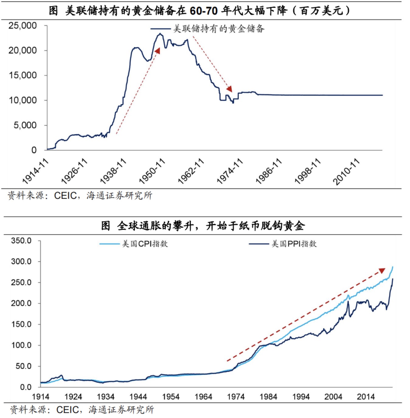 第二,紙幣的信仰面臨挑戰,各大央行控制通脹的決心和能力受到質疑。二戰以後,在佈雷頓森林體系的安排下,美元掛鈎黃金,其它貨幣掛鈎美元,紙幣的發行還是受到一定限制的。但隨着美國國際收支赤字的不斷擴大,人們對美元的信心逐漸減弱,不斷用美元兑換黃金,美聯儲持有的黃金儲備大幅下降。1971 年美國停止了美元兑換黃金,1973 年佈雷頓森林體系徹底崩潰,全球進入了紙幣發行不受控制的時代。在人們相信紙幣不會被隨意印刷的時候,央行控制通脹的意願還是有一定的信任度的;但當人們發現紙幣可以不受限制的被印刷的時候,央行控制通脹的意願和能力都會受到質疑,就會導致較高的通脹預期。Ben Bernanke 提出了這種觀點,他認為,美聯儲控制通脹的信譽喪失,推升了通脹預期,使得菲利普斯曲線上移,帶來了更高的通脹和更高的失業率。而事實恰恰也是如此,全球通脹的大幅攀升,就是開始於紙幣脱鈎黃金之後。