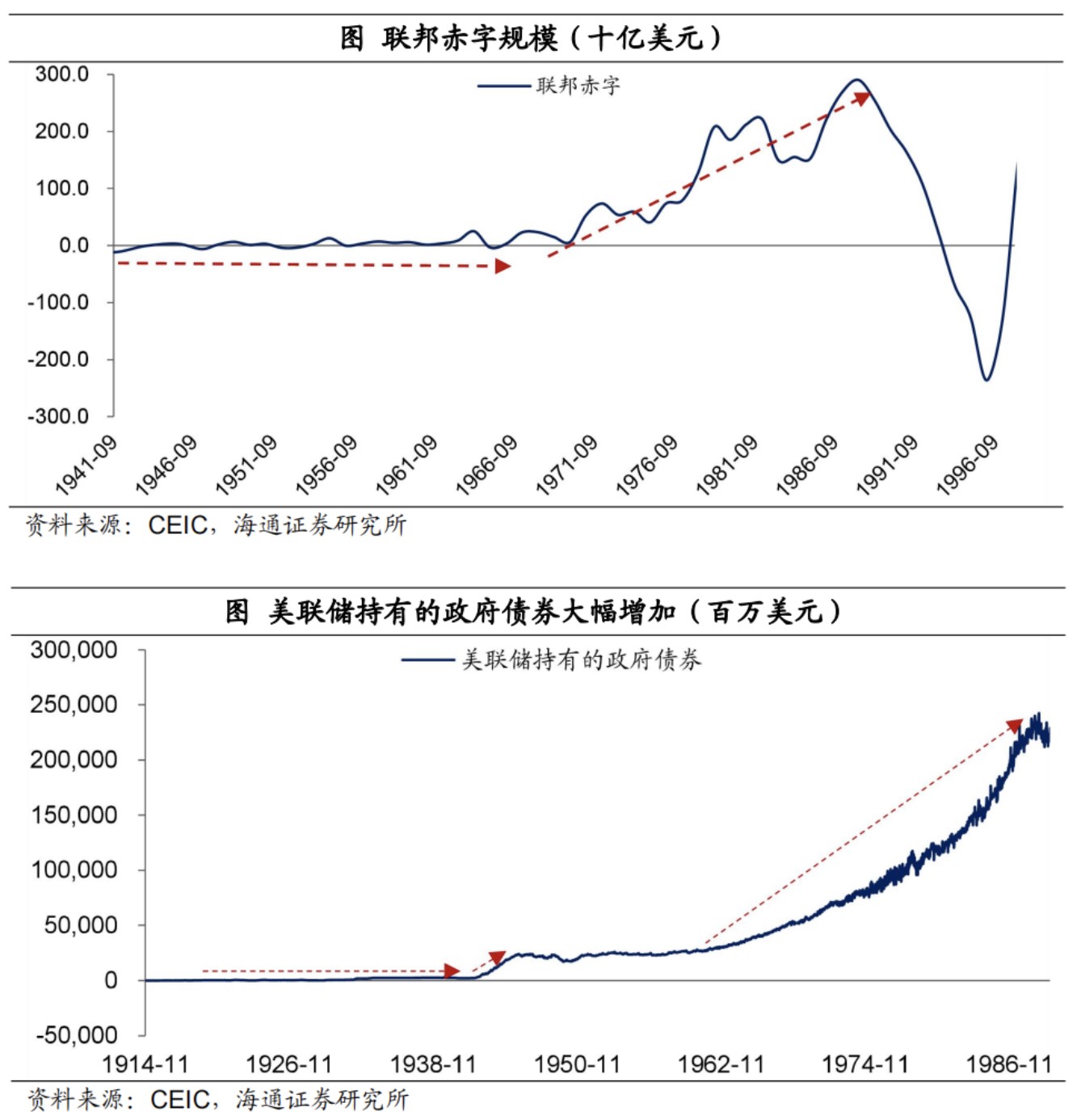從歷史上來看,貨幣的超發往往是伴隨着財政的擴張的,而且財政擴張往往是貨幣超發的重要途徑。例如在一戰期間,軍費開支推動美國財政大幅擴張,貨幣跟隨超發,帶來了明顯的通脹壓力。在 60 年代之前,美國的財政赤字程度是比較小的,而且大多數時間是處於盈餘的狀態。從 1964 年開始,美國當時總統 Lyndon Johnson 推出了實行多年的 “偉大社會” 計劃(Great Society Legislation),本質上就是一攬子財政刺激方案,再加上當時越南戰爭的開支增加,美國的財政赤字明顯擴張。與此同時,當時美聯儲的貨幣政策配合財政的擴張計劃,一方面延遲貨幣政策的收緊,另一方面不斷向銀行體系注入流動性,為政府債券的發行保駕護航。