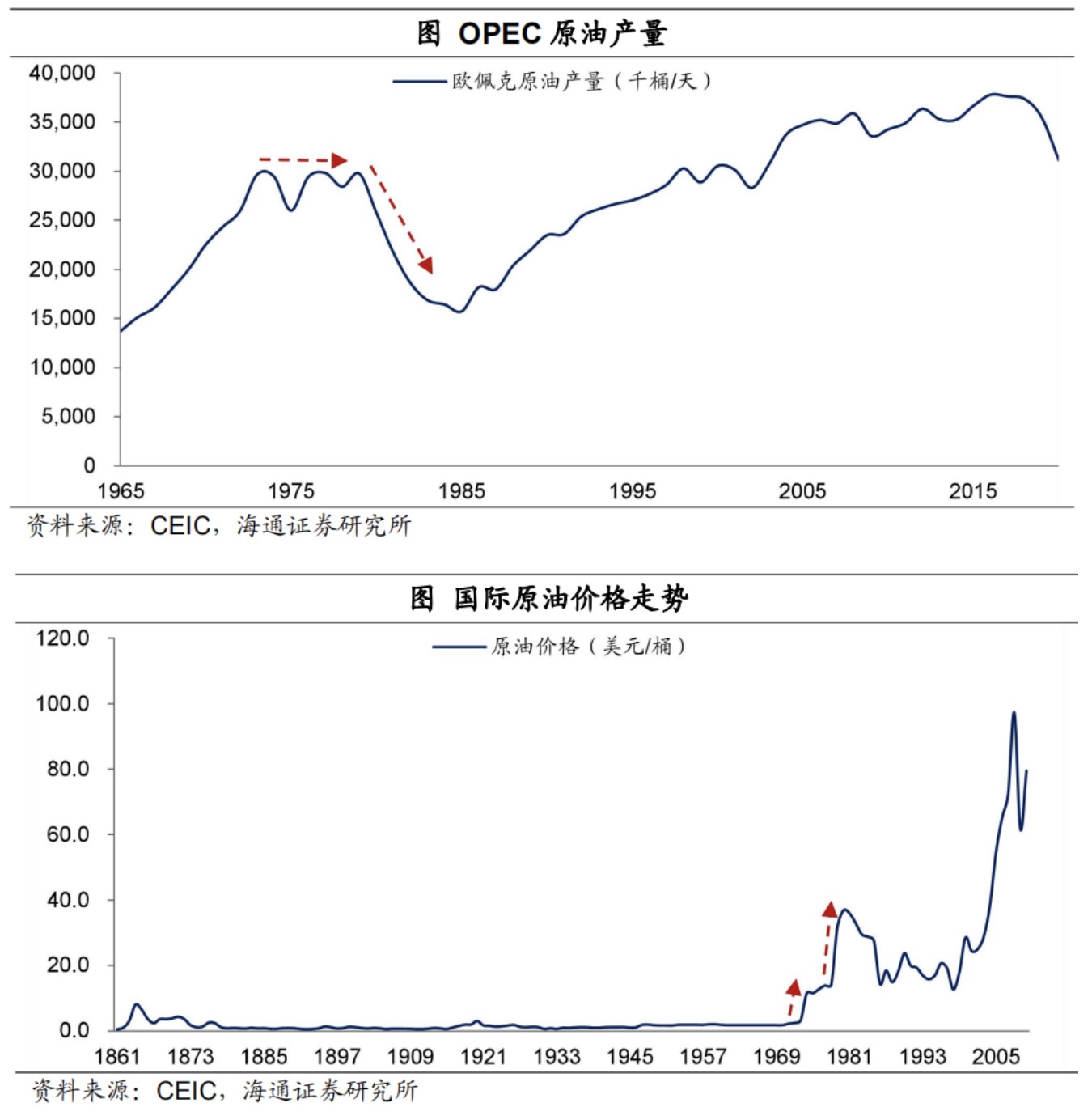 第三,是供給端的衝擊。在 1973 年和 1979 年爆發了兩次能源危機,第一次能源危機中,國際油價上漲了 3 倍;第二次能源危機中,國際油價又上漲了一倍多。原油價格的上升,推升了經濟運行的成本,是滯脹的重要原因。供給端的衝擊,其實很大幅度的強化了貨幣超發對通脹的推升作用。