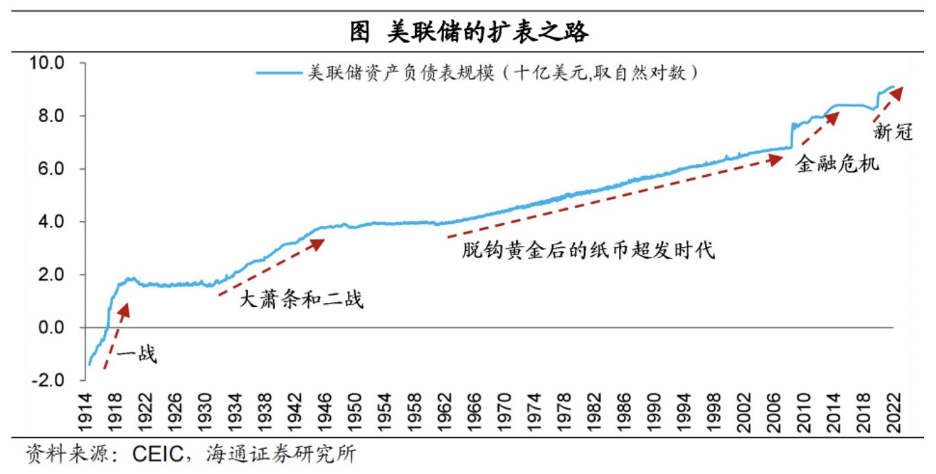 從貨幣超發的角度,2020 年面對新冠疫情的衝擊,主要央行都在大幅超發貨幣,而且貨幣和財政配合,這和一戰、二戰、60 年代都比較類似,而且這一次力度更大更迅猛。