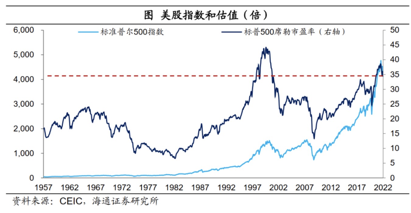 美股或依然存在壓力。從宏觀面來看,美國需求端相對還比較強勁,當前經濟還處於典型的通脹階段,但未來經濟實際增長回落的可能性比較大,即慢慢也陷入滯脹的困境。參考之前的經驗,高利率、高通脹、低增長的滯脹環境,並不利於權益類資產的表現。而且當前權益估值還處於歷史高位,或依然存在一定的調整壓力。