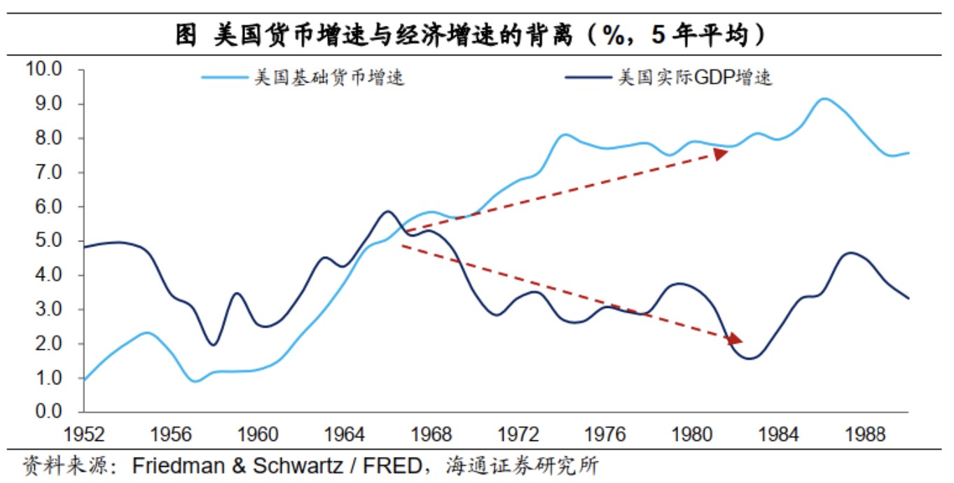 在 60 年代中期之前,美國的基礎貨幣增速平均比實際經濟增速低 1.8 個百分點;而之後美國基礎貨幣增速開始超過實際經濟增速,而且幅度不斷擴大,從 1967 年至 2007 年,美國平均基礎貨幣增速要比經濟增速高 3.9 個百分點,貨幣超發勢必帶來了通脹壓力的增加。