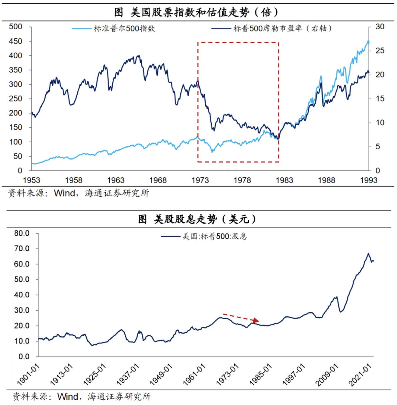 美股的表現可謂比較慘淡。一方面,大宗漲價推升經濟成本,衝擊企業盈利,在整個滯脹期間,美股股息明顯下滑;另一方面,利率的大幅上升,打壓權益資產的估值,標普 500 市盈率從最高時的 18 倍以上,最低降至只有 7 倍附近。標普 500 指數從 1973 年開始下跌,最大跌幅高達 46%,直到 1974 年 9 月以後才開始觸底慢慢回升。