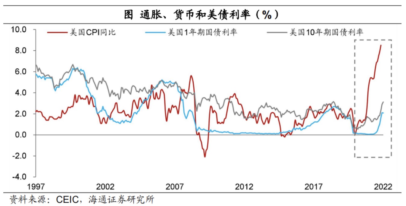 考慮到通脹的壓力,美聯儲本輪加息的時間可能也會比較長,而且利率終值可能高於上一輪。所以和 80 年代初有些類似,美聯儲貨幣政策的收緊,或支持 10 年期美債利率進一步上行,並逐漸與短債利率倒掛於高位。當然後續長債利率的上行速度會慢於短債利率,美元長債利率的中長期配置價值在逐漸增加。