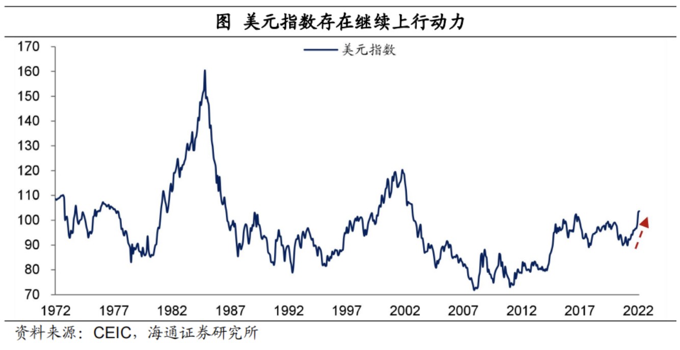 美元指數在未來幾個月仍然有上行動力。美國國內貨幣政策還在收緊,利率水平在抬升,而且美元指數本身就是各國之間經濟相對強弱的體現,在當前主要經濟體中,歐洲已經陷入滯脹,貨幣政策或小幅收緊,日本經濟增長乏力,貨幣政策寬鬆繼續,這些相對變化也支持美元指數或進一步上行。